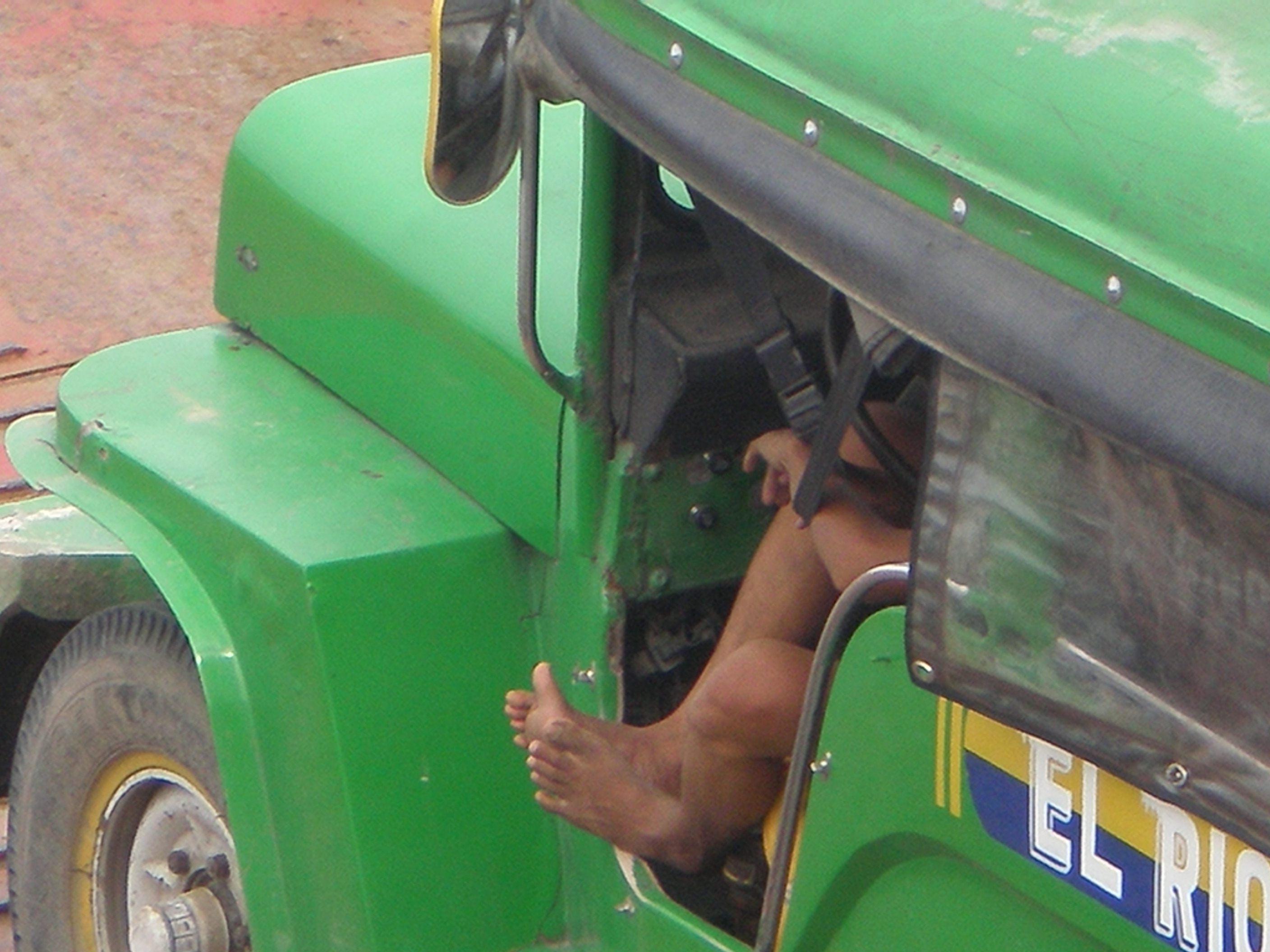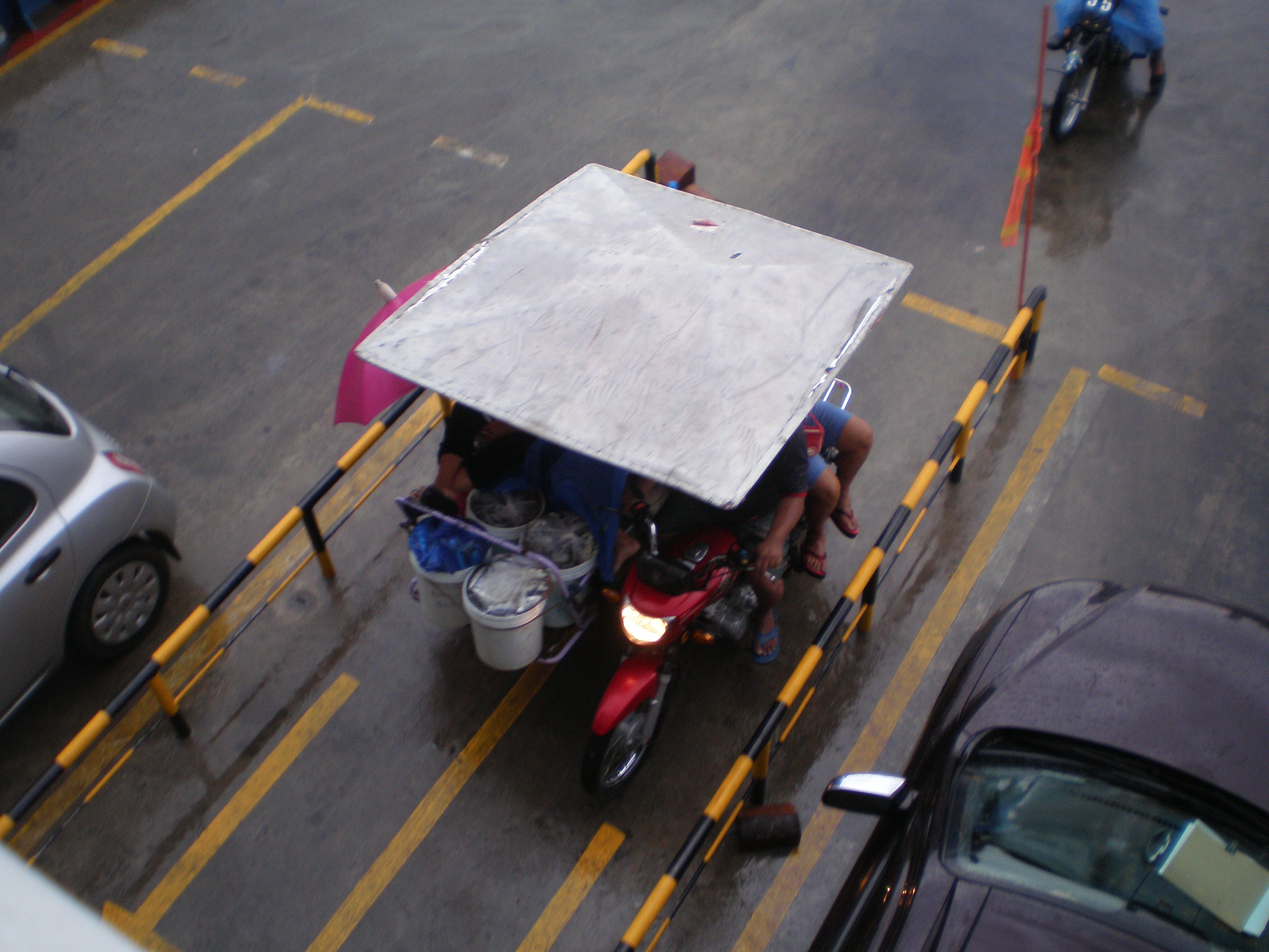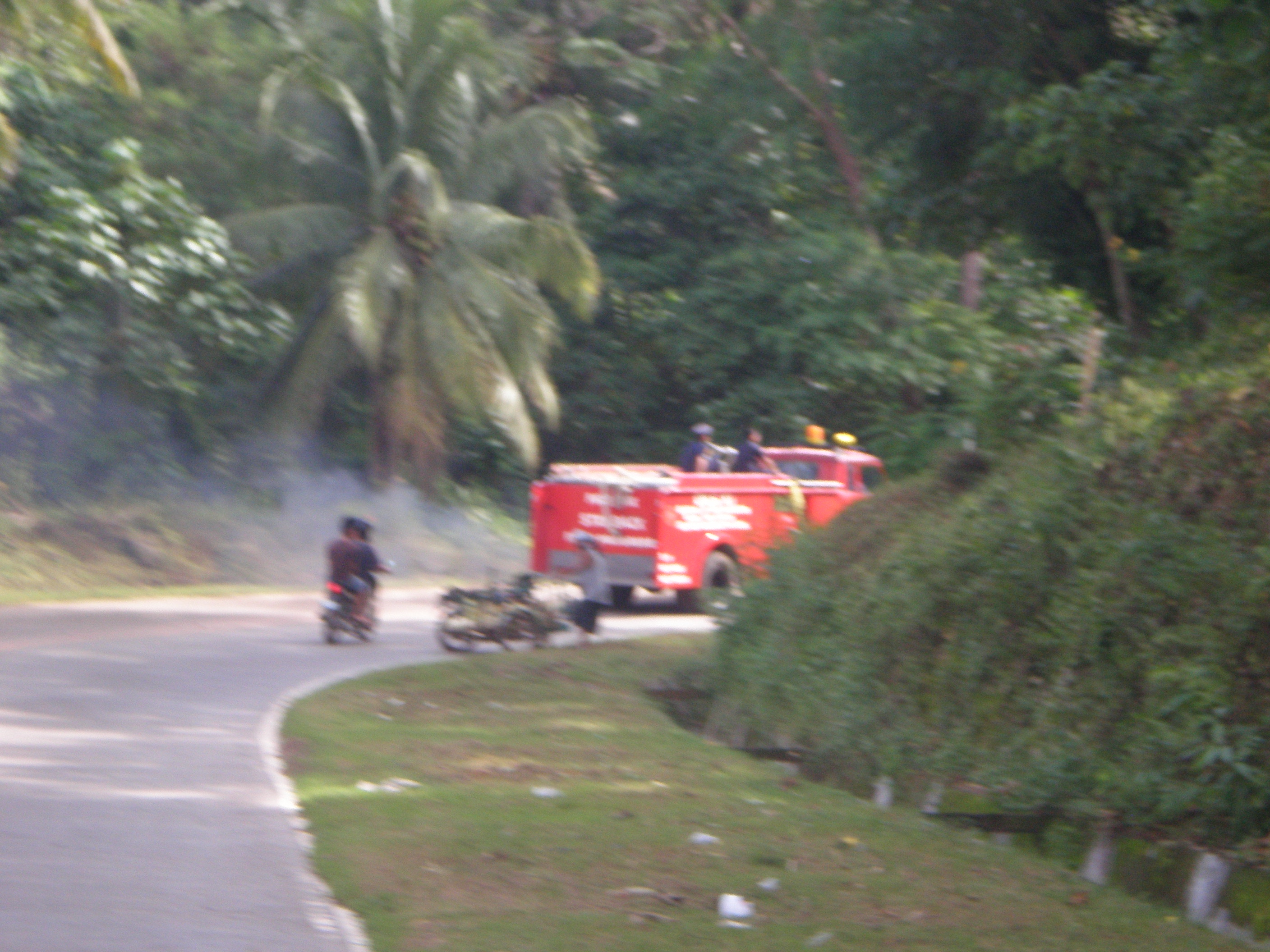 A firecar, it came out so much smoke from it on the road so one could believe that the firecar was on fire itself, ha ha! And it was not driving fast, they need a faster one! The tricycle on the fairy was filled with people in the rainy weather. Also the busdriver had some rest with his feet out through the window…