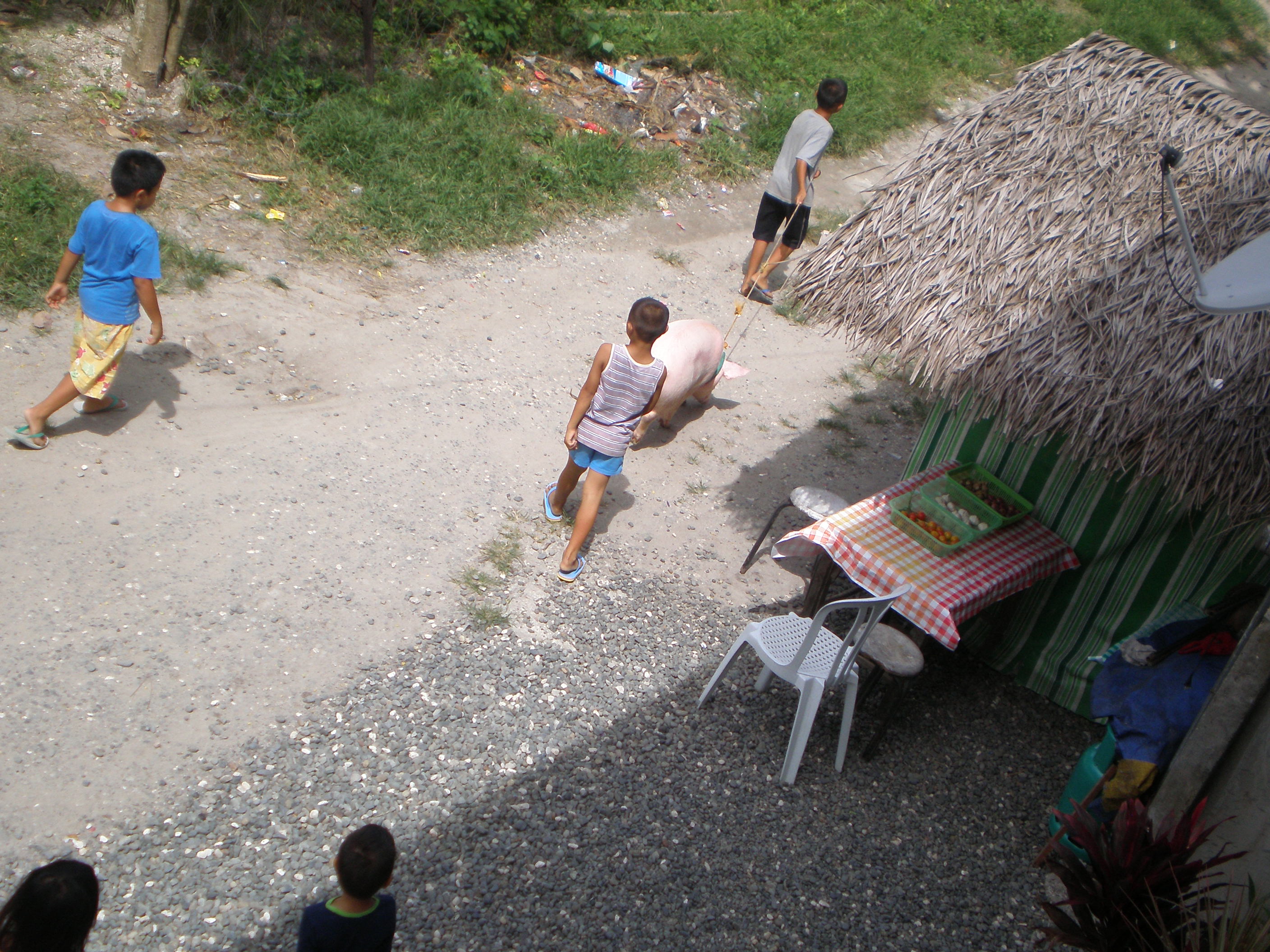 George outside the laundry shop, they wash our clothes every week. It cost 100 pesos for 6 kilos, It´s about 1 euro 20 cents and 10 swedish crowns. The lovely pig lives in front of us, in one of the neigbors gardens. Sometimes they move the animals to other places so they have new grass to eat. Basket is a big thing here, and we often see them play…