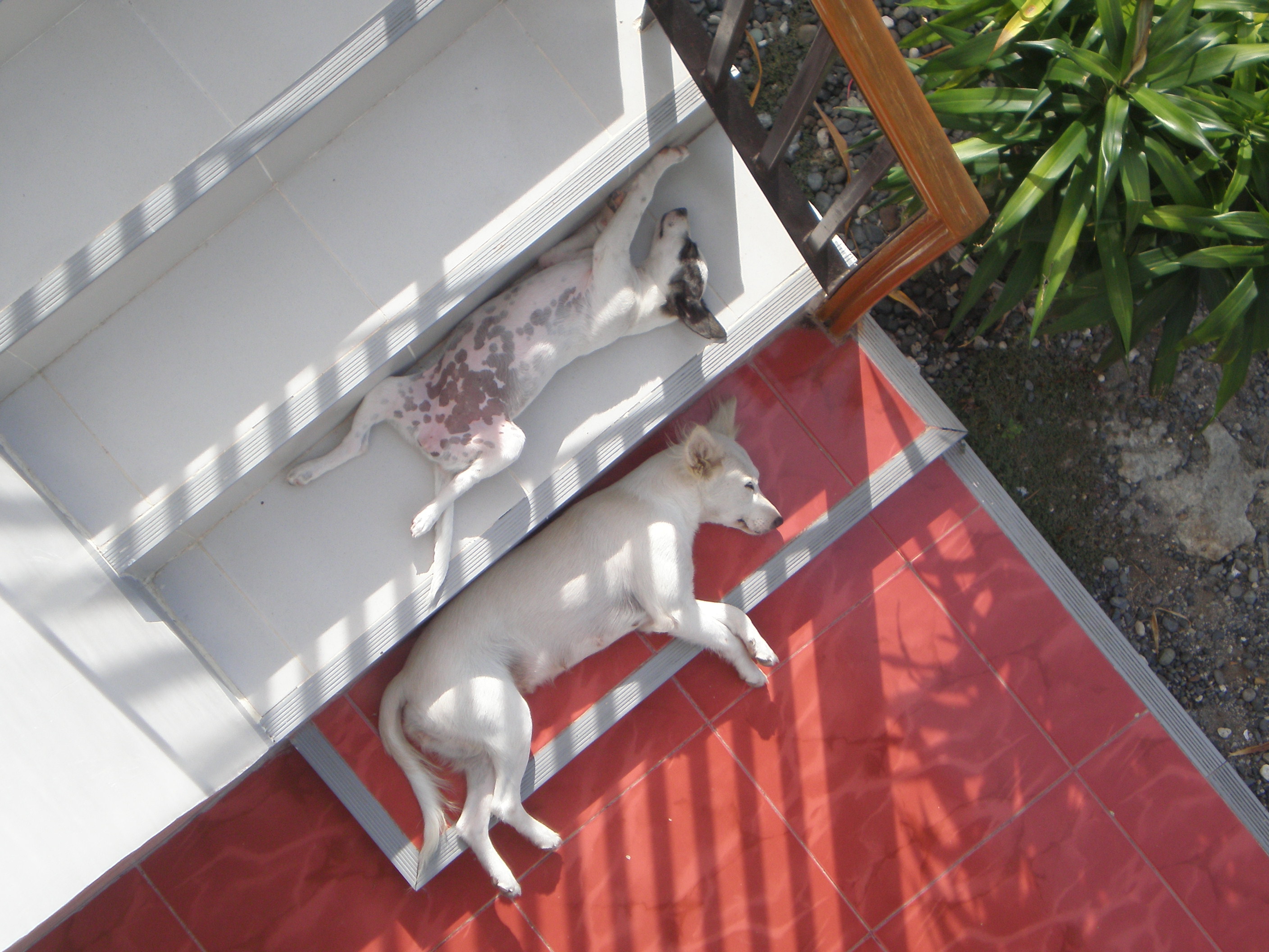 Do you see the rat on the dark picture? That´s one of the rats i see running in front of me in the evenings.The puppy Monica with her mother on the stairs. They always sleep outside in the nights.