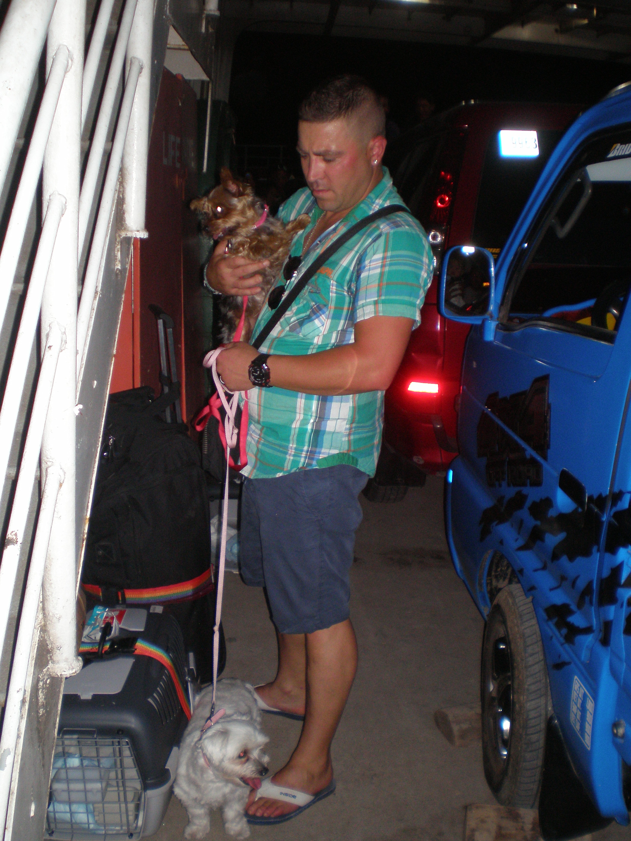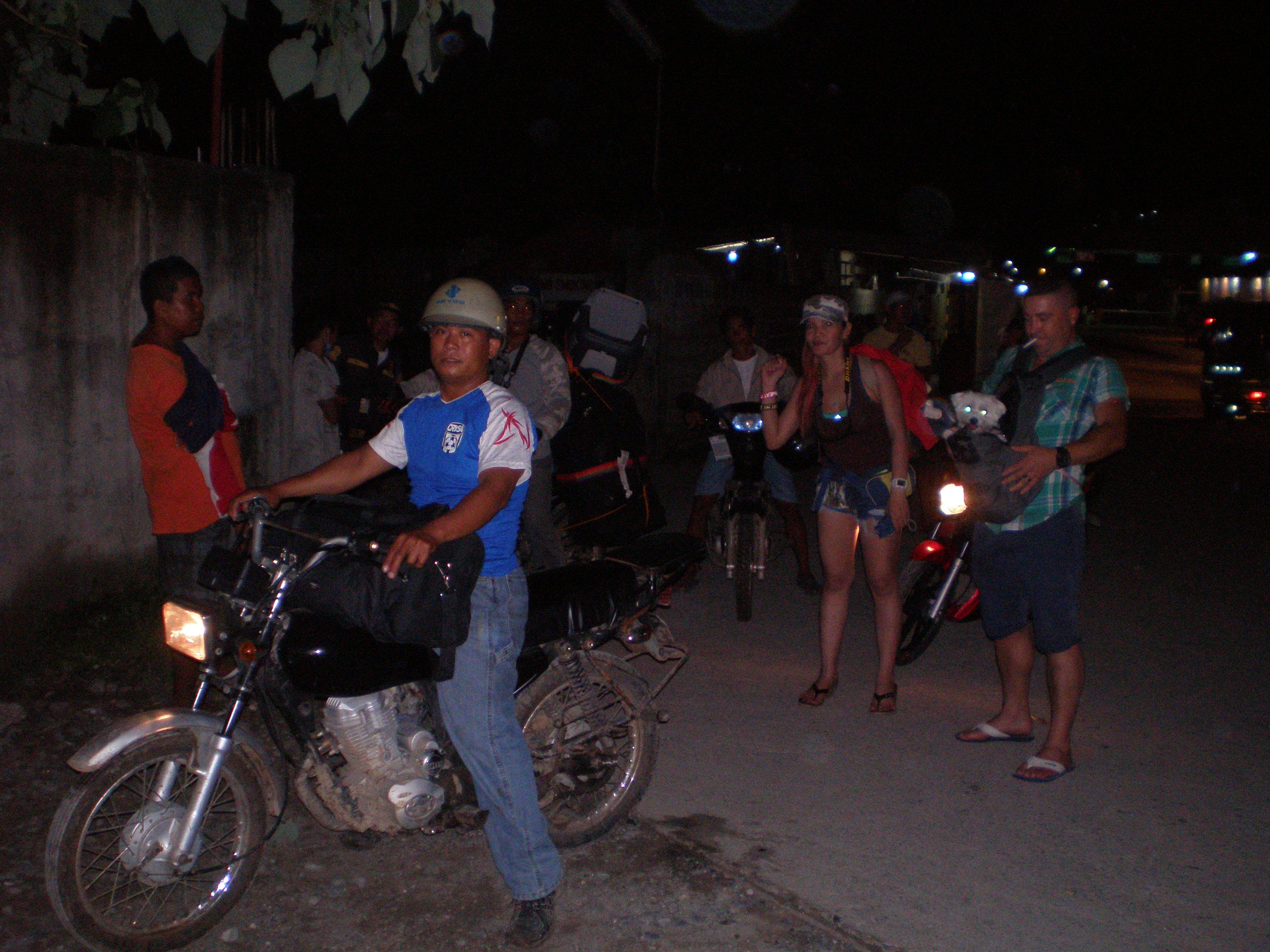 We arrived at Davao airport at 5 pm, picked up our luggage and the dogs and then we took a taxi outside the building. After a short while we came to the harbour in Davao. A lot of people, no signs and cars and buses everywhere. Found the woman who sold the fairy tickets, not so helpful but we managed. Tha fairy was filled with funny cars and the people was sitting on the top of the cars to hold on to their belongings. Amazing how it is here and in Thailand. You have to be here to understand how strange, funny and special their world and life is and how they manage. The people are so poor but they fix and make solutions for every barrier they meet. When we reached Samal I had to get some motorcycles that could drive us to the house we have rent. Met a girl, she organized everything with 3 other men and off we go in to the djungle with 2 big suitcases, handluggages, two dogs and their cages. 4 motorcycles the girls included, she took on the role as the manager and off we go. We were in the middle of the woods and sometimes she needed to ask people we met if we where at the right path. The roadtrip was so funny and my dog Elvira she didn´t want to miss a second, she was so exited and checked everything. Emma was with George on another motocycle. The dogs were sitting in backpackages on our breasts. 20 minutes fast ride on a muddy small path, no street lamps and with drivers we never met before. One must have faith that everything is going to be fine when you travel as we are at the moment. Everything worked out fine but my butt hurt a lot after this motorcycle trip, ha ha. The house is nice and clean but tomorrow we move to another house, 100 meters away from here with better internet and telephone connections, need it for my work. Shall try to sleep some more hours now, are so tired with nearly no sleep for two days. It takes a while before the body get used to the new time. It´s 7 hours time difference to Europe. Here is some pictures from today. The first with the bus and tricycles are from Manila and the other pictures is from the fairy trip to our island Samal around 18.30 and the small shop close to our house. We bought some sardines cannes in tomato sauce, we wanted to celebrate our arrivel and were so hungry, ha ha!